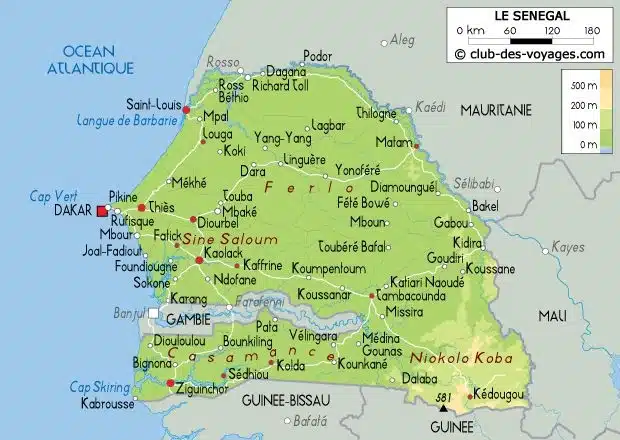 Ouvert à l’ouest sur l’océan Atlantique, le pays est bordé par la Mauritanie au nord, le Mali à l’est, la Guinée et la Guinée-Bissau au sud, et entoure presque entièrement la Gambie. Le paysage est varié, allant des plaines côtières aux zones semi-arides du nord, en passant par les savanes et forêts du sud.